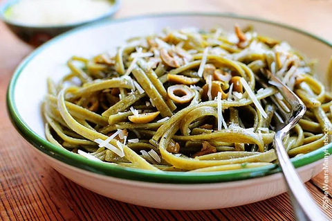菠菜面采用新鲜的菠菜汁和菠菜纤维制造。菠菜面不含人造调味,即健康又好吃